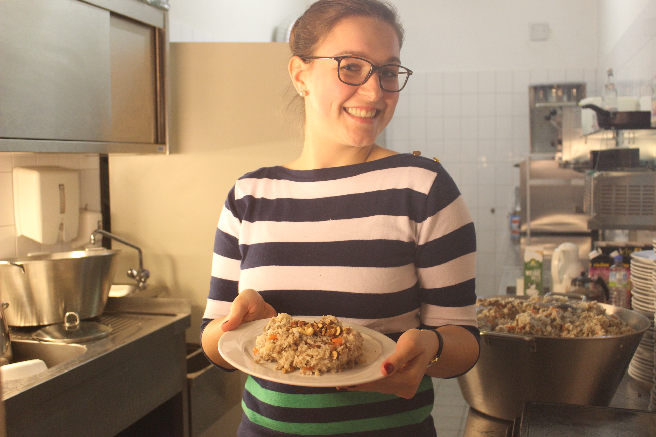 Anschliessend an die circa dreistündige Wanderung trafen wir uns in den Räumlichkeiten des Weingutes F. Herke und Sohn ein und genossen ‚den syrischen Teil der Veranstaltung‘, das von zwei Studenten zubereitete Abendessen `Schillbatuh Ruzz Bill Lahmeh‘ in geselliger Runde. Dieses Reisgericht findet man im Kochbuch des in Syrien bekannten Fernsehkochs Fadi Alauwad, welcher 2014 aus seinem Heimatland mit seiner Frau und den gemeinsamen drei Töchtern aus Syrien floh und in Deutschland als ‚Gastgeschenk‘ seine kulinarische Welt veröffentlichte.